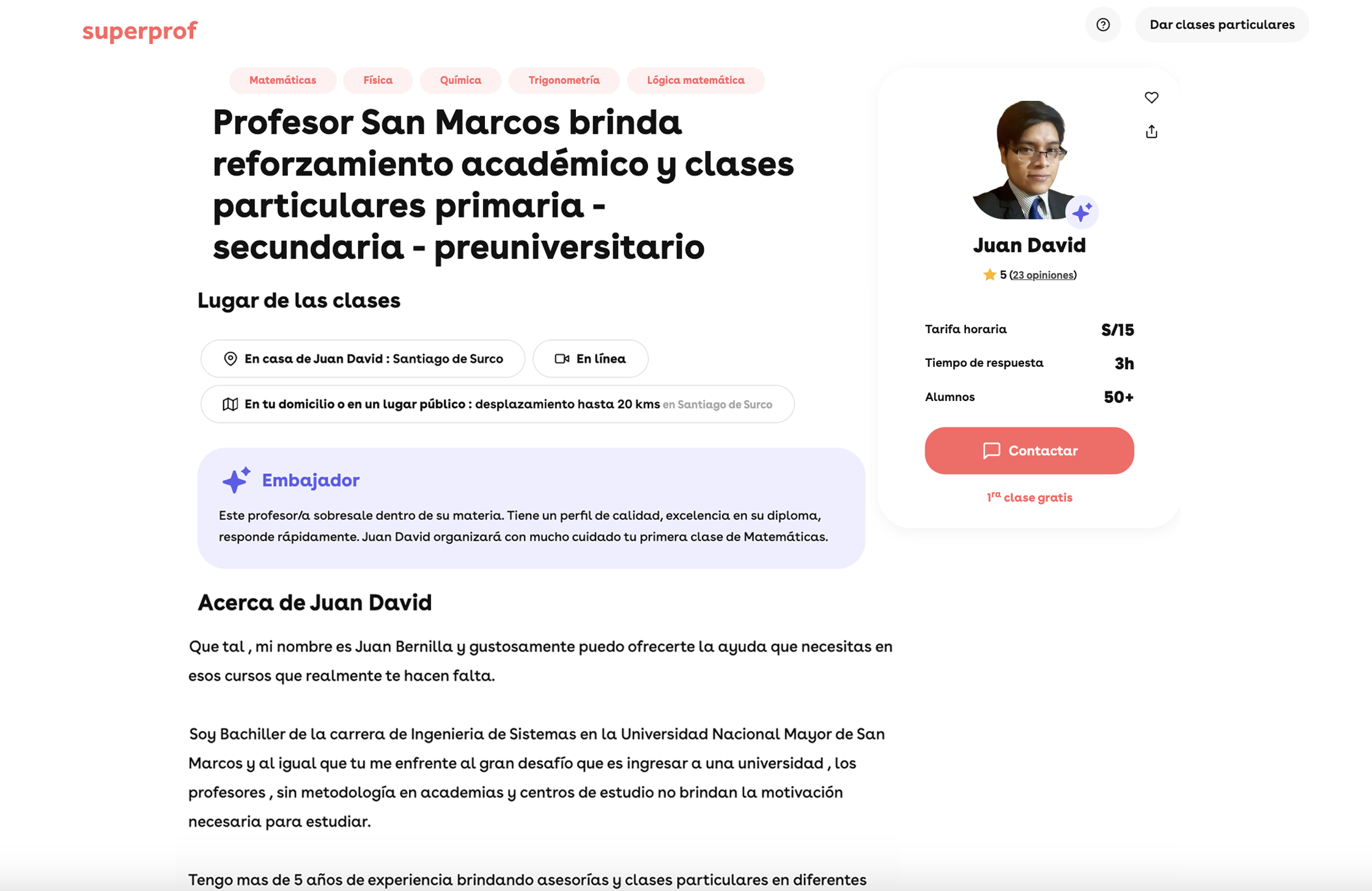 Por ejemplo, el anuncio de Vicente, un profesor de matemáticas en Lima con numerosas reseñas positivas, muestra cómo mejoraron las notas de sus alumnos: